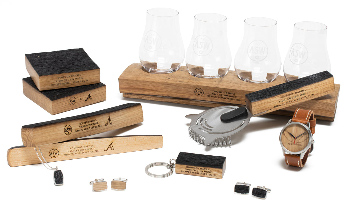 This project celebrated the collaboration of whiskey distiller ASW and the Atlanta Braves. ASW released a limited Braves '21 World Series commemorative batch of Fiddler Chin Music aged on staves of Georgia oak, with maple bats from Tennessee's Old Hickory Bat Co. in each barrel. The barrel staves & bats were transferred to Tokens for a second distillation: to be turned into unique items for gifting and retail.