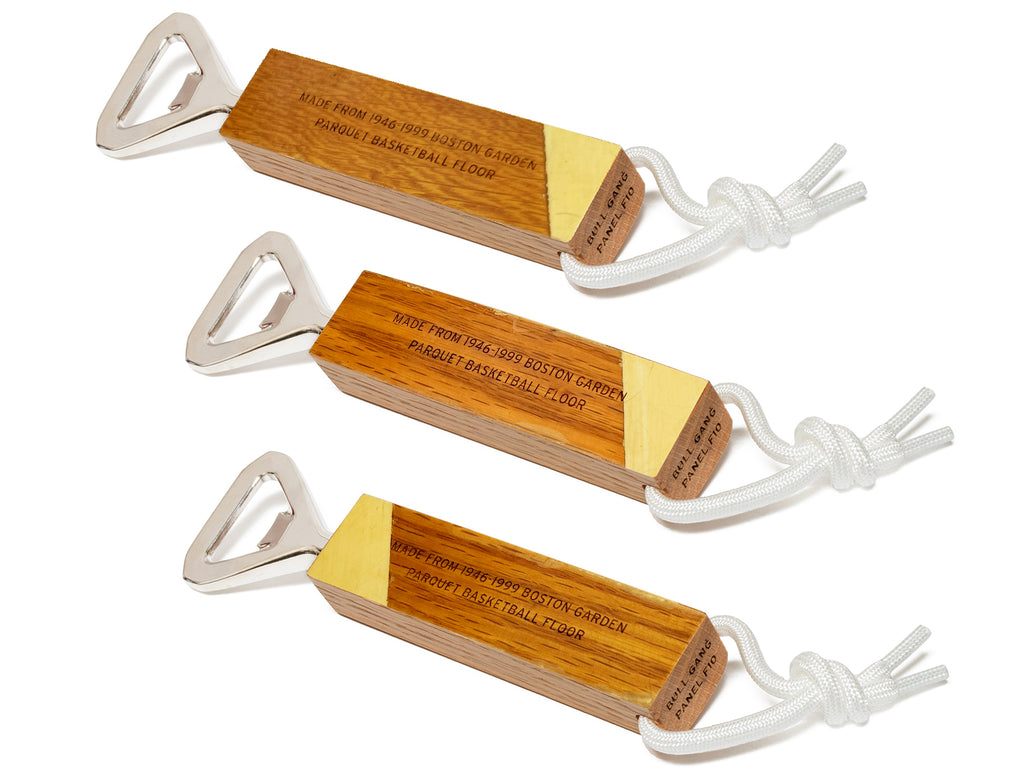 This bottle opener is crafted from authentic Boston Garden parquet basketball floor which was in use from 1946-1999. Wood features scuffs and scratches of the floor on which the Celtics won 16 of their 18 Championships. Quality nickel-plated hardware and engraved with arena name. Officially licensed by TD Garden. Each 5' by 5' parquet panel had a long history of being laid down and picked up by the ever-faithful Boston Garden Bull Gang who followed a map specifying each panel's position.