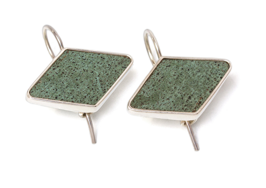 Copper roof panels were recovered during a restoration project. Set in sterling silver with a fish hook finding, these earrings feature the patinated copper surface of the roof. Set in the shape of the iconic diamond geometry often found in Wright's work. The back side of each cuff links is hallmarked "Graycliff." Each pair of cuff links comes gift boxed with a Certificate of Authenticity.