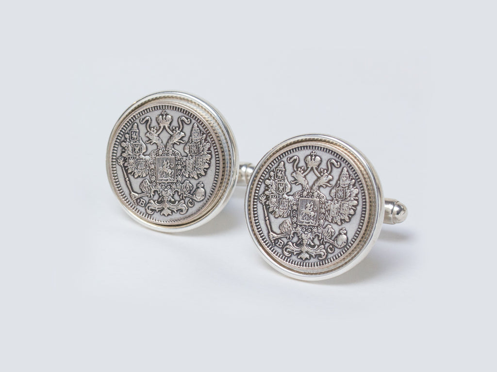 These cuff links are crafted from authentic Russian 20 kopek coins. Set in a sterling silver solid bezel with a swivel finding, each pair of cuff links comes gift-boxed with a Certificate of Authenticity.