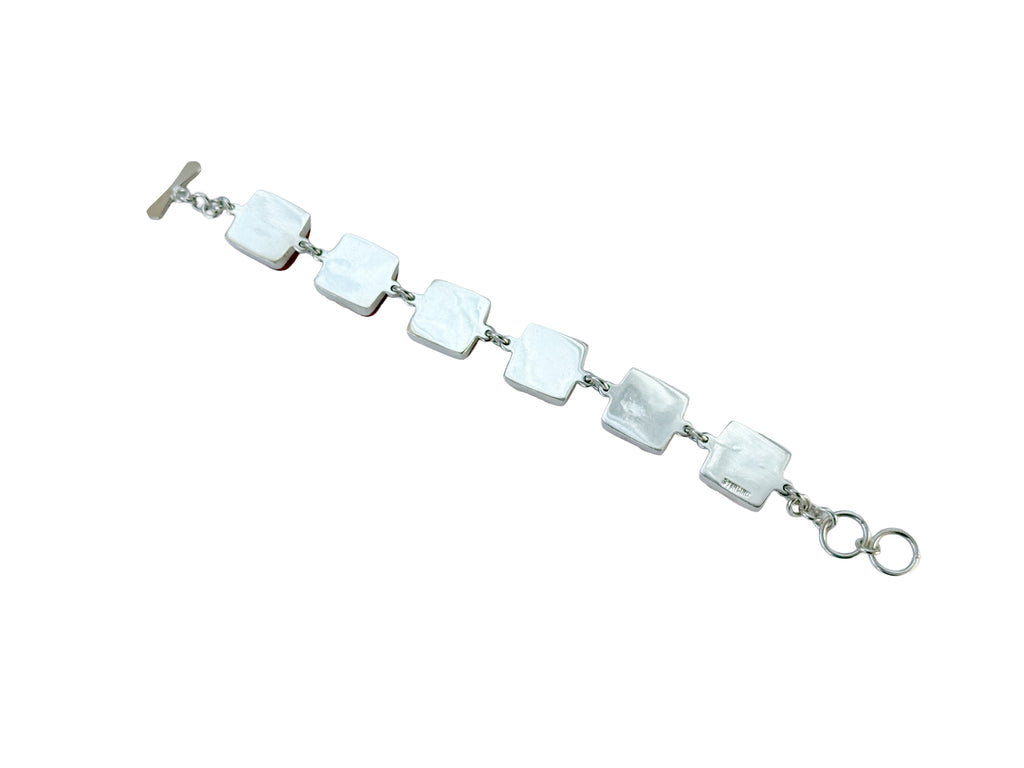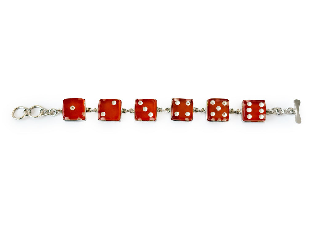 This bracelet features a six orange resin dice that have each been cut in half and placed in a sterling silver bezel on a charm toggle bracelet. Comes with a certificate of authenticity and a gift box.