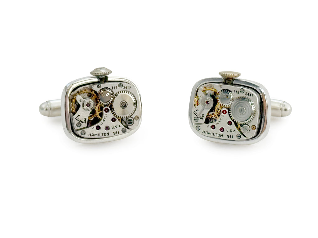 This collection features Watch Movements that were manufactured by makers whose names are still recognized around the world. All cuff links or pendants are set in sterling silver. Movements may feature a silver or gold/brass tone. While all movements originally had crowns (winders) many detached thru the decades. Tokens doesn't amend or alter the movement. If there is no longer a winder we simply set as is for a streamlined look. Note watch parts are not functional and do not wind. Each pair of cuff links comes gift-boxed with a Certificate of Authenticity.